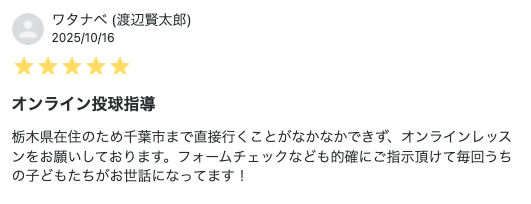 「栃木県在住のため千葉市まで直接行くことがなかなかできず、オンラインレッスンをお願いしております。フォームチェックなども的確にご指示頂けて、毎回うちの子どもたちがお世話になっています!」