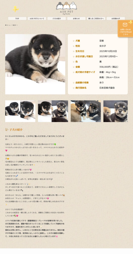 ASH PET様では新しい子犬が生まれるたびに情報をすぐに追加し、常に最新の状態で閲覧者にお届けできる体制を整えています。