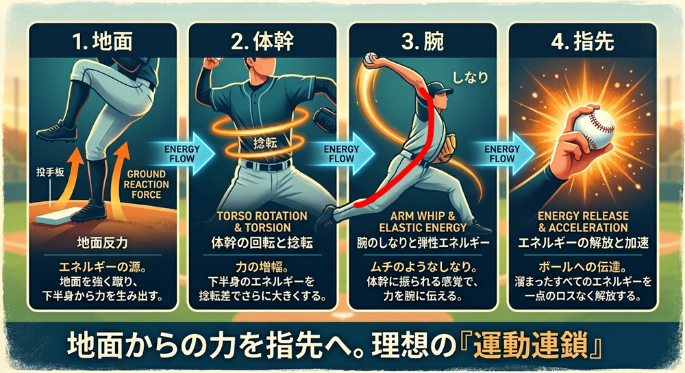 ピッチャーとは、地面から生まれた力を指先まで運ぶ「専門職」です。
