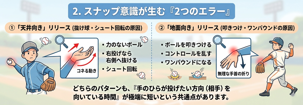 「スナップを使おう」と強く思いすぎている選手には、大きく分けて2つのエラーパターンが見られます。