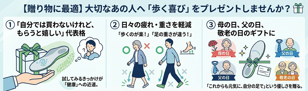 「真軸インソール」を贈ることは、単にモノを贈ることではなく、「これからも元気に、自分の足で歩いてほしい」というあなたの優しさを贈ることに他なりません。