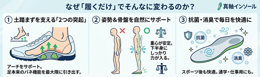 でも、真軸インソールには、私たちがこだわり抜いた「3つの秘密」があるんです。