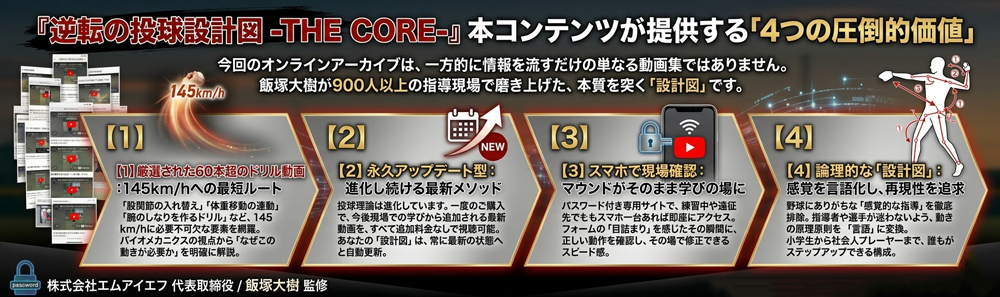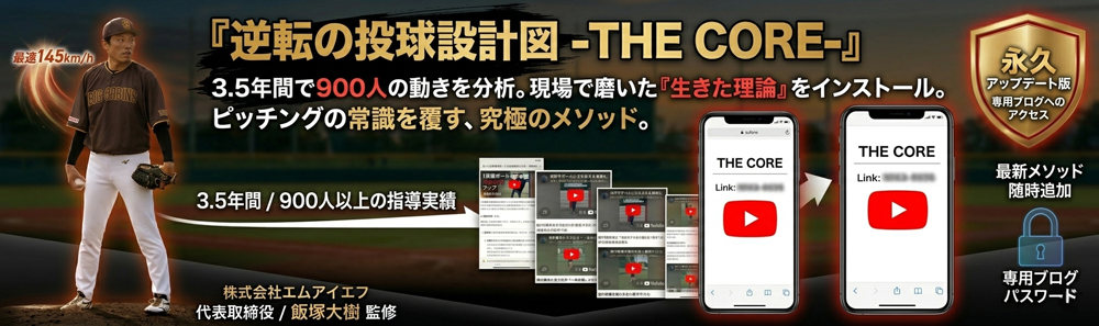 本教材『逆転の投球設計図 -THE CORE-』では、私が身をもって体感し、900人以上の指導で磨き上げた「力を最大限に発揮させるための具体的な方法論」を動画で分かりやすく解説しています。