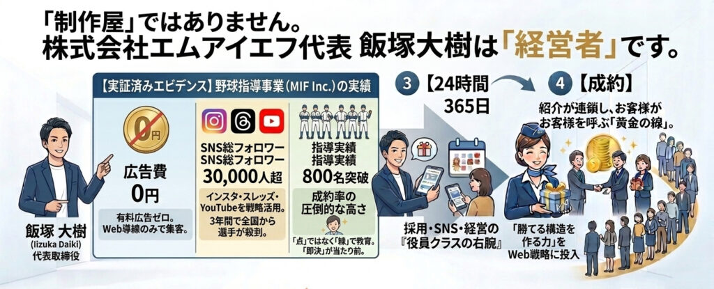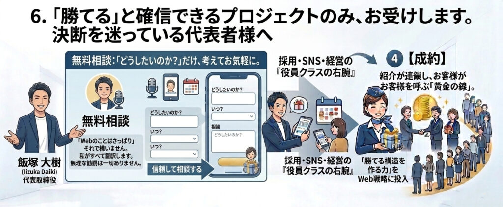 • 内容: ホームページで「飯塚流の言語化」を炸裂させます。他社との違いを明確にし、価格競争という泥沼からあなたを救い出します。